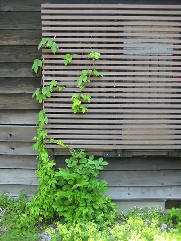 昨年よりも更に生長を感じさせてくれるのは、喜八の窓下に2年前に植えたホップです。去年は窓の格子にちょっぴり絡んだだけで喜んでいたのですが、今年はその格子への絡み方も緩やかでどこか余裕があり、なかなか良い雰囲気なのです。
