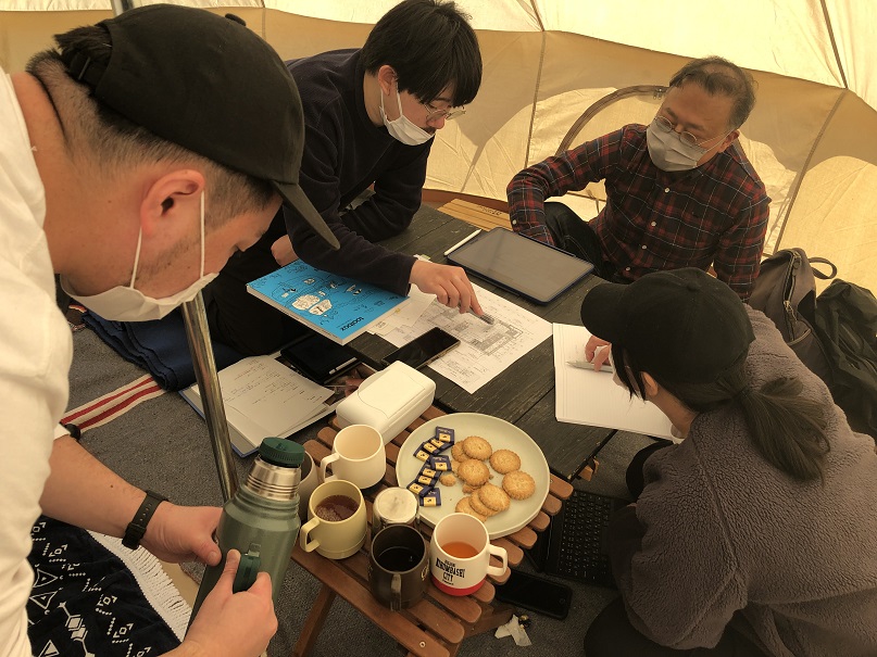 お茶や珈琲、お茶菓子まで準備していただき、大興奮!まだまだ風が冷たい日ではありましたがテント内は寒さを感じることもなく、キャンプ道具も山盛りのご家族が暮らす住宅のための詰めの打合せは快適に完了。スタッフ一同、心躍る時間となりました。