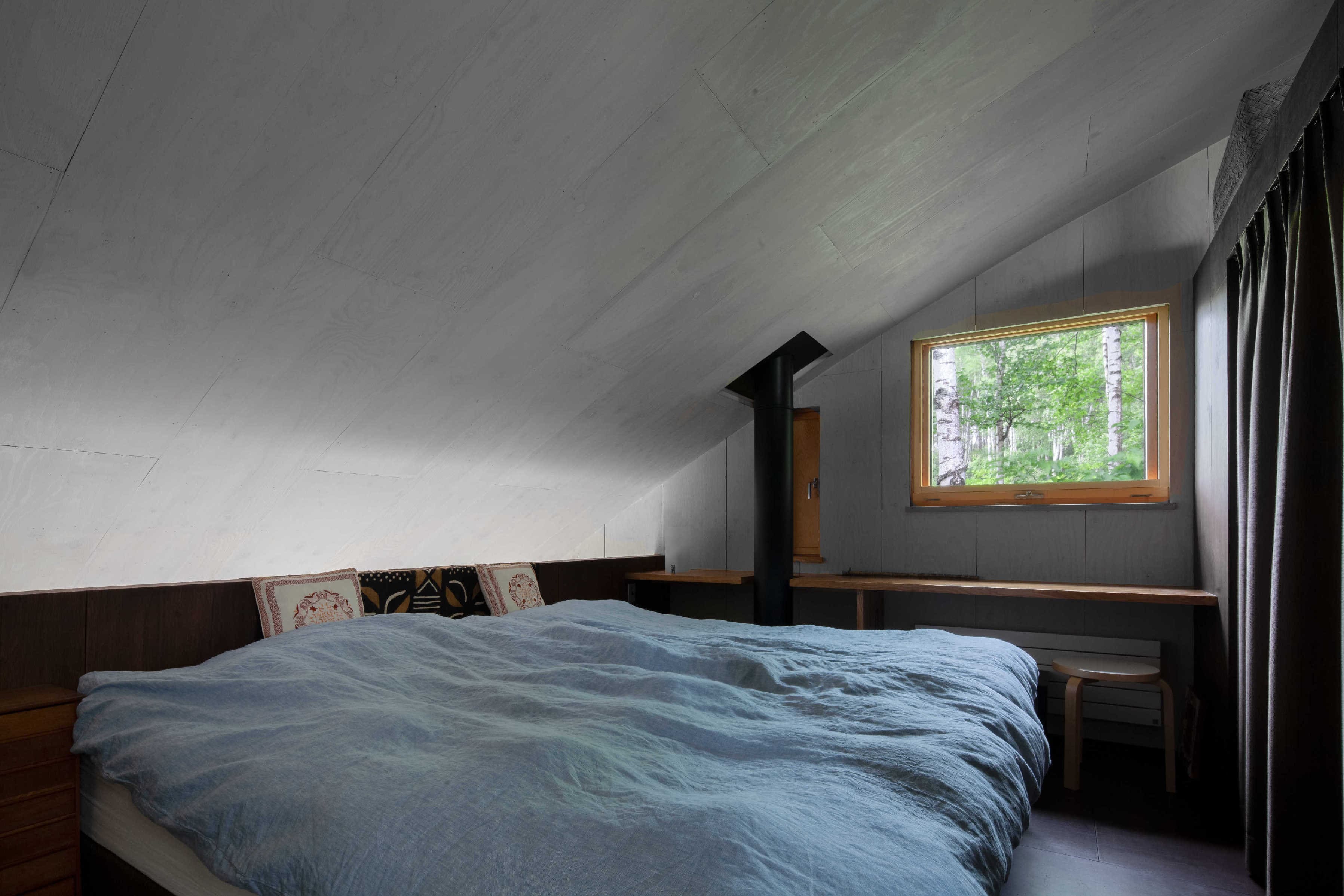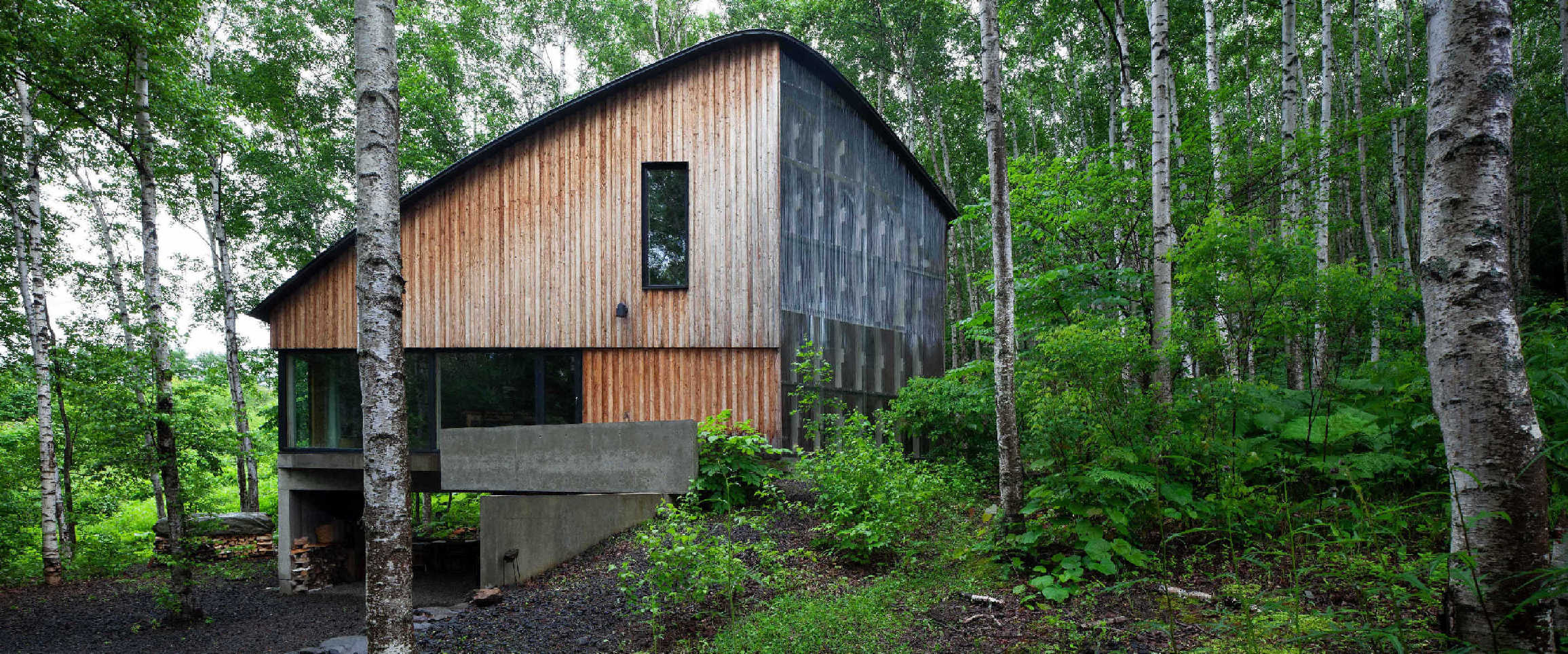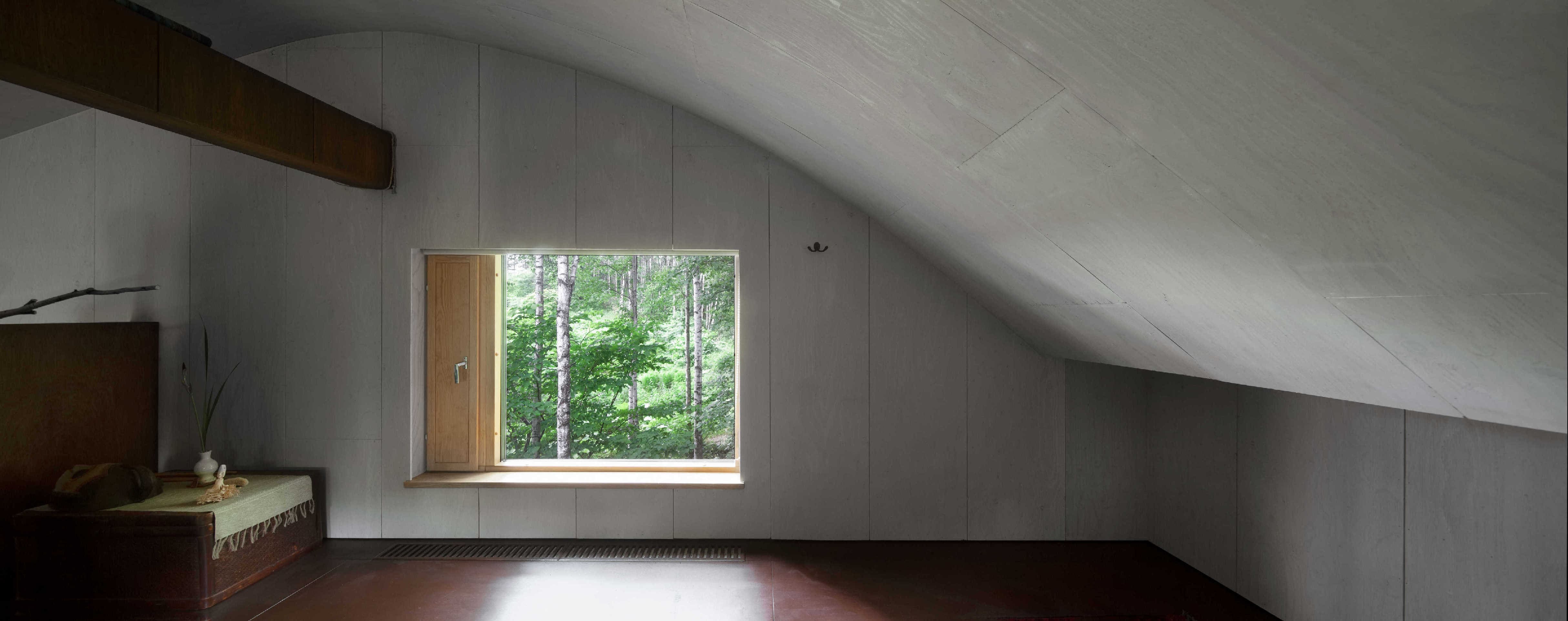 この白樺の森を最初に訪れた時、今ここで感じている光、風、音、そして遠方に広がる網走湖の風景をこのまま感じられるような建築を実現したいと考えた。内部は、ゆるやかな曲線を描いた屋根型に寄り添うようにリビングからの光が壁から天井へと連なり、最上階のLoftまでひとつながりに包まれた空間がつくられている。
