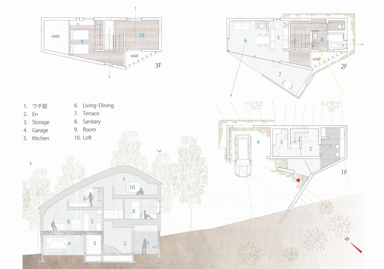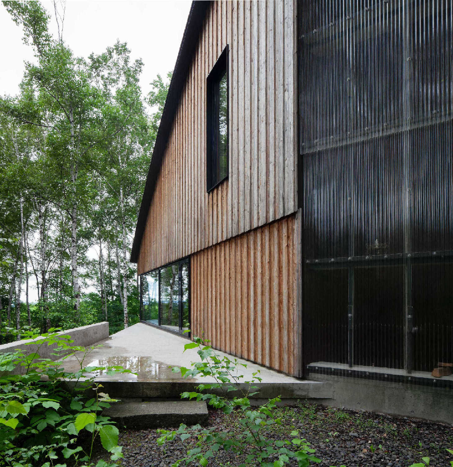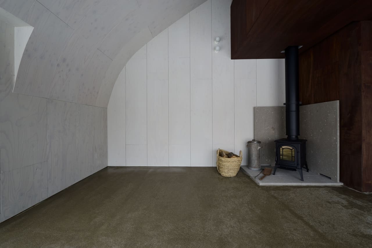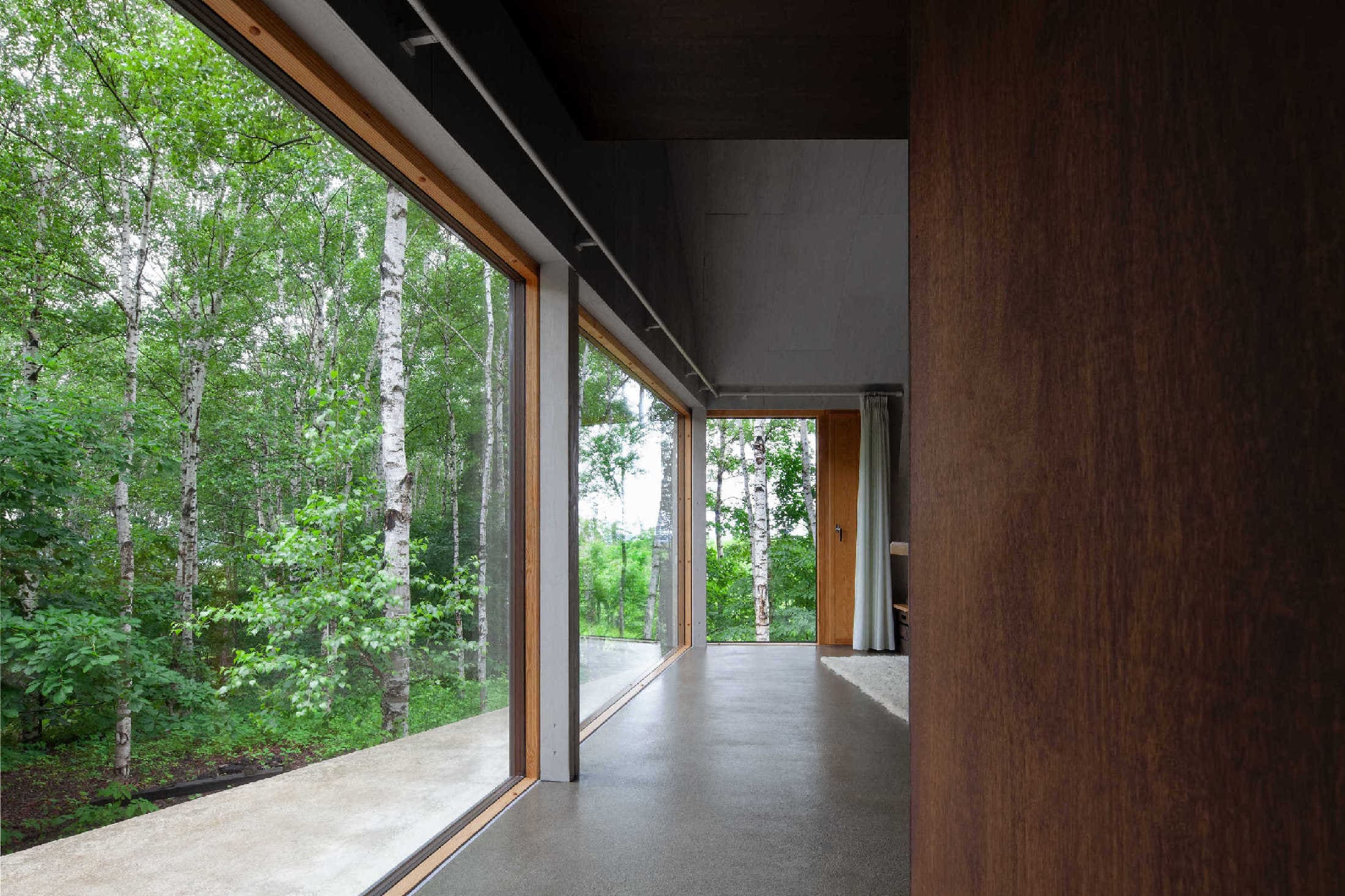 この白樺の森を最初に訪れた時、今ここで感じている光、風、音、そして遠方に広がる網走湖の風景をこのまま感じられるような建築を実現したいと考えた。内部は、ゆるやかな曲線を描いた屋根型に寄り添うようにリビングからの光が壁から天井へと連なり、最上階のLoftまでひとつながりに包まれた空間がつくられている。
