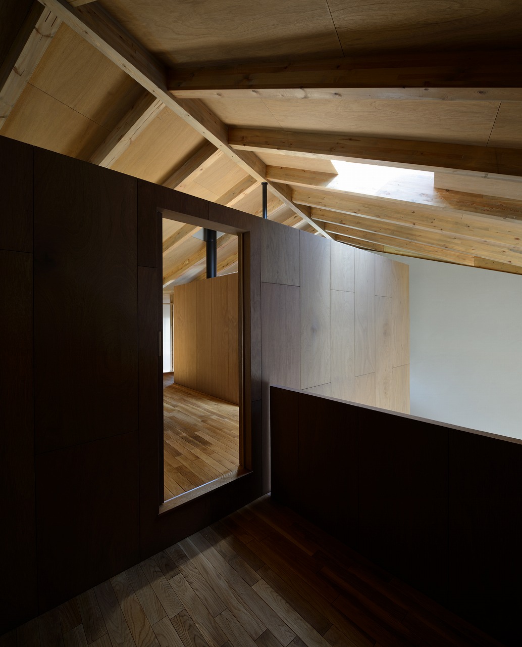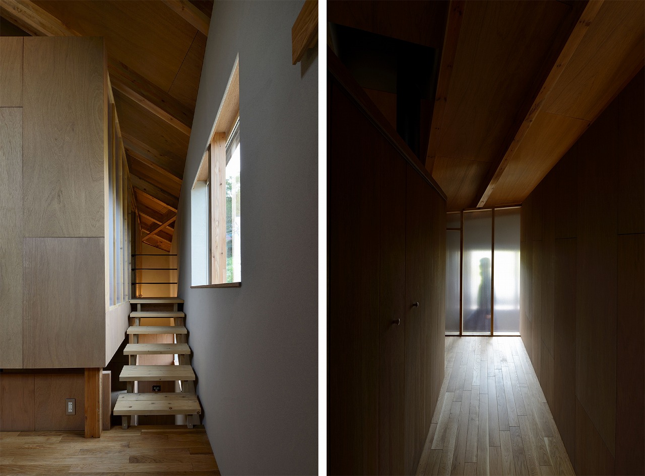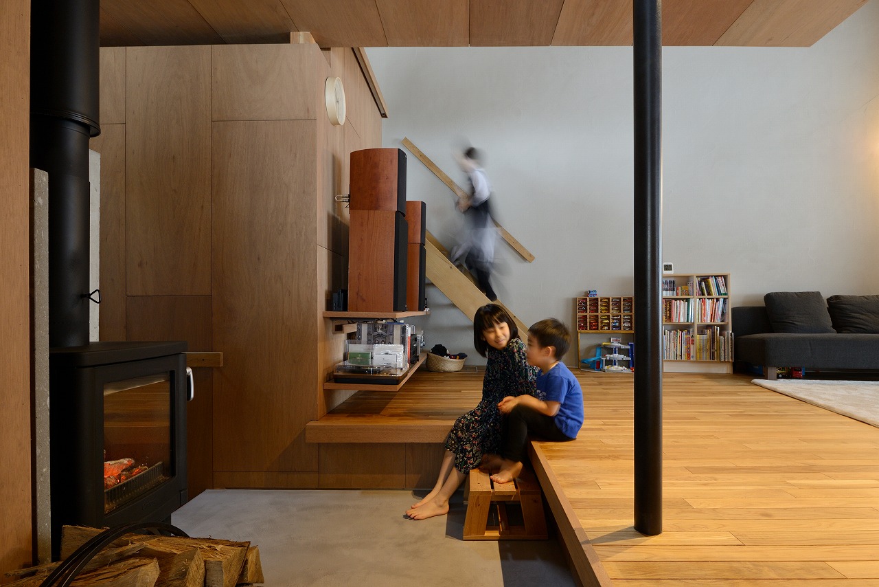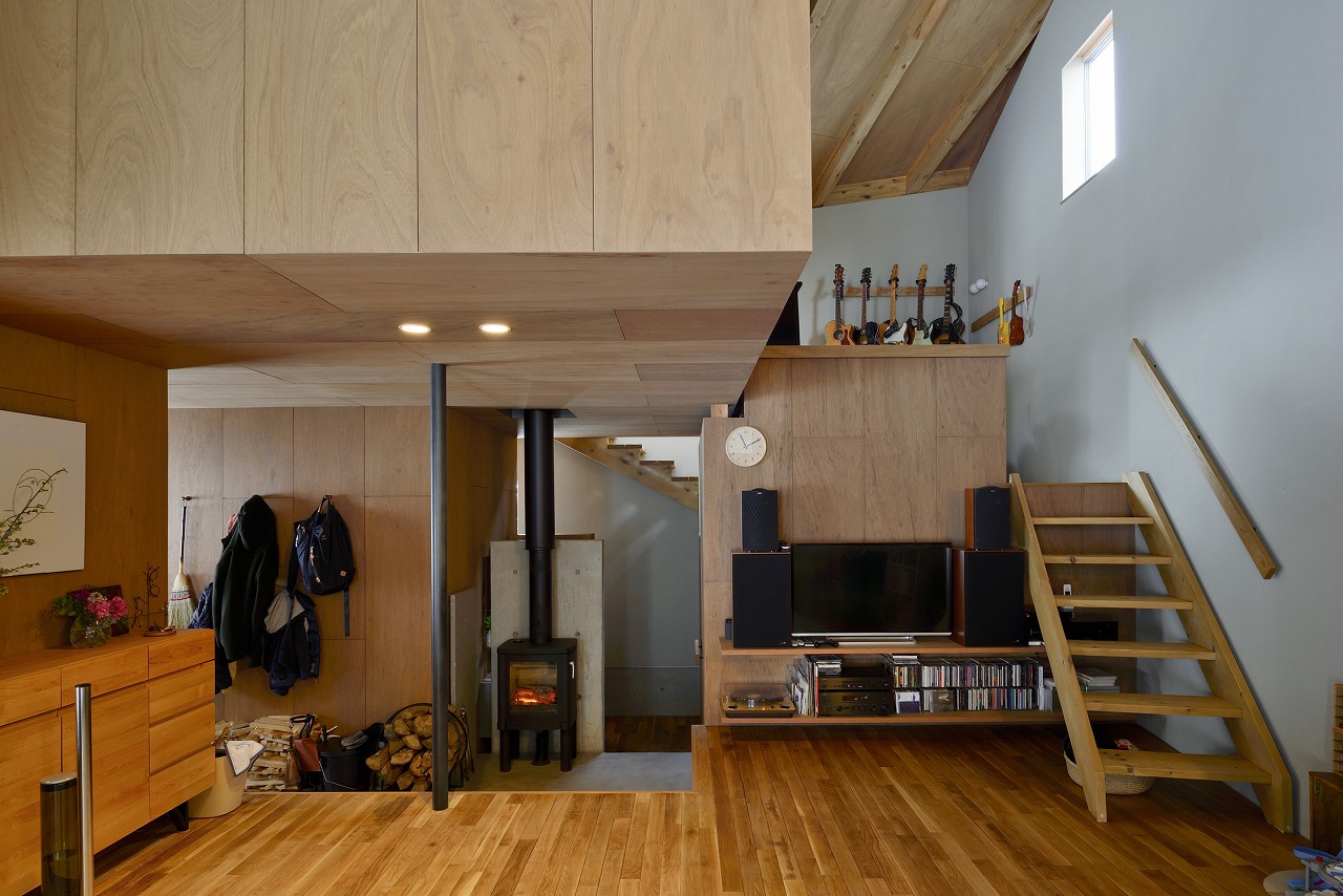 2018年 札幌市中央区 31坪・103㎡ 撮影 佐藤文昭・小島康敬 「薪ストーブがある家にしたい」という家族の要望からつくられた家。大きな箱(家)の中心に薪ストーブが据えられ、その上部に小さな箱となる小部屋が浮いたように配置される。この大小の箱の隙間を暖房熱が上昇して家全体が暖められる。光は逆にこの隙間を介して拡散され、やさしい光の場を生み出している。