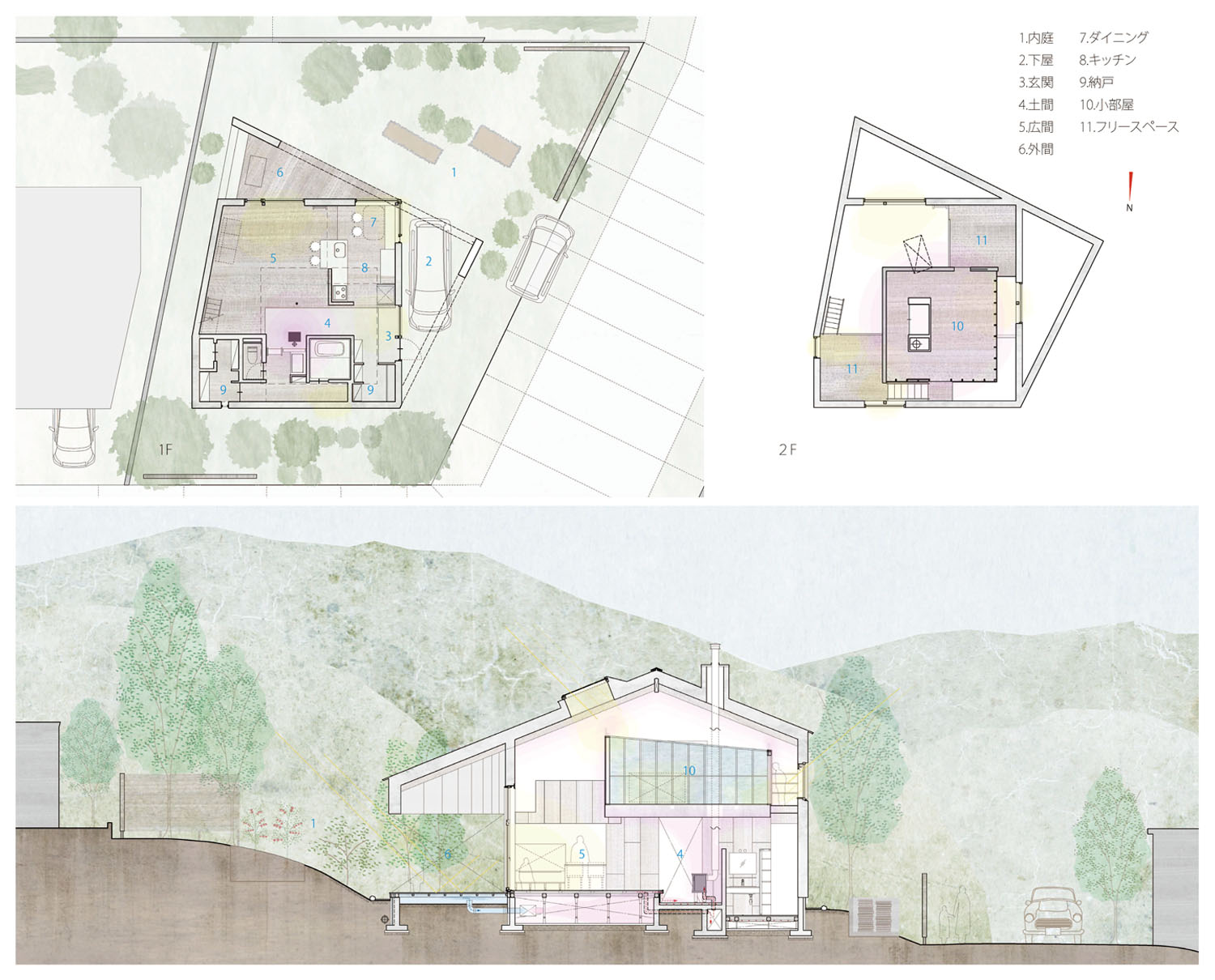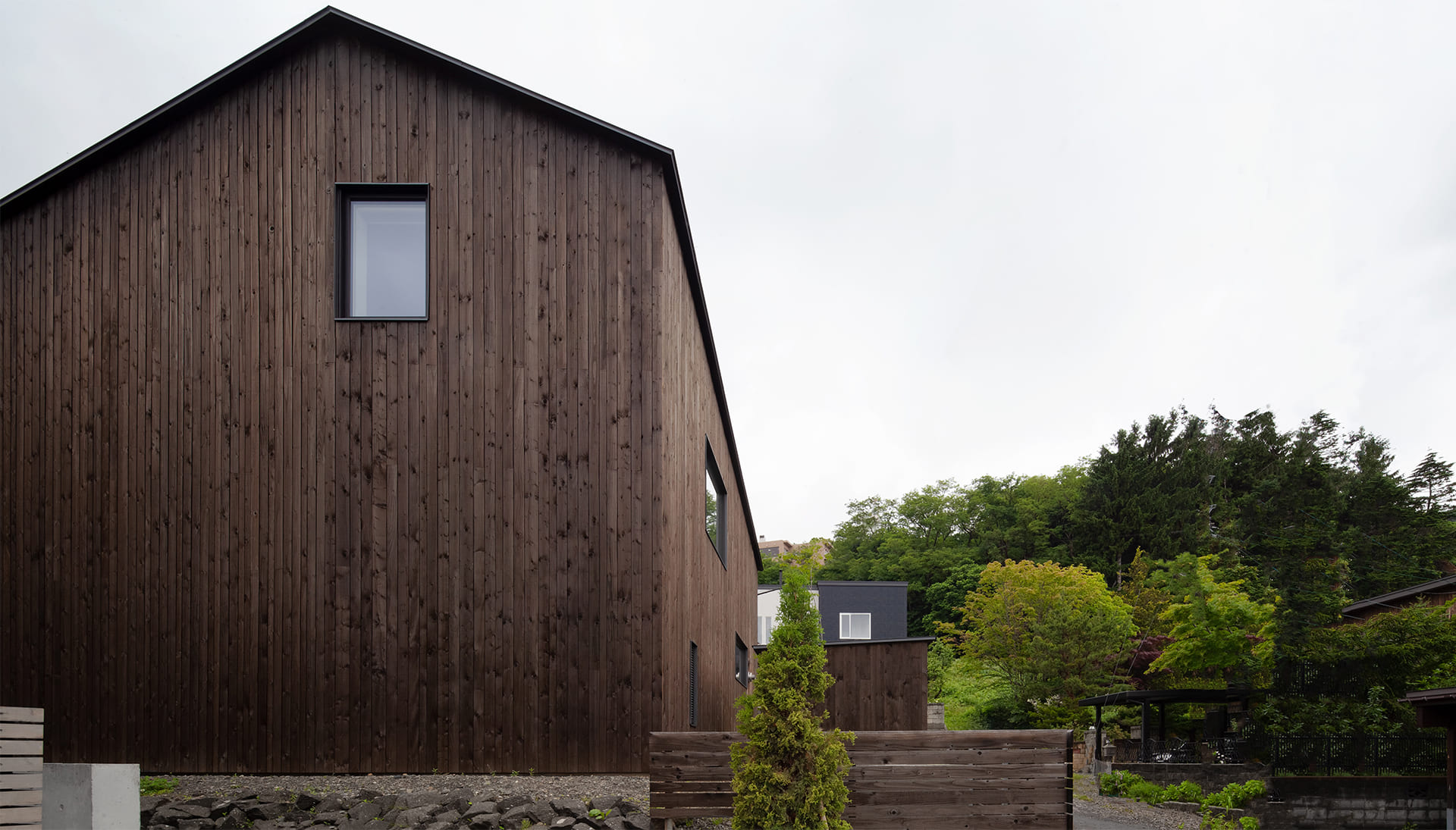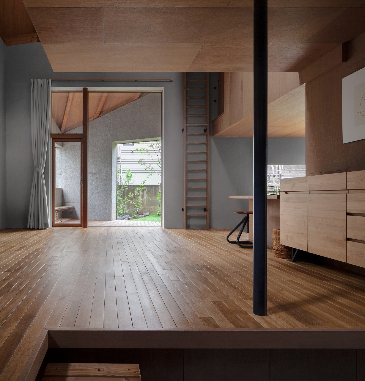 2018年 札幌市中央区 31坪・103㎡ 撮影 佐藤文昭・小島康敬 「薪ストーブがある家にしたい」という家族の要望からつくられた家。大きな箱(家)の中心に薪ストーブが据えられ、その上部に小さな箱となる小部屋が浮いたように配置される。この大小の箱の隙間を暖房熱が上昇して家全体が暖められる。光は逆にこの隙間を介して拡散され、やさしい光の場を生み出している。