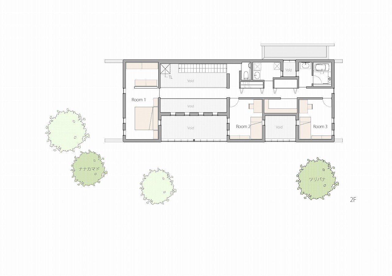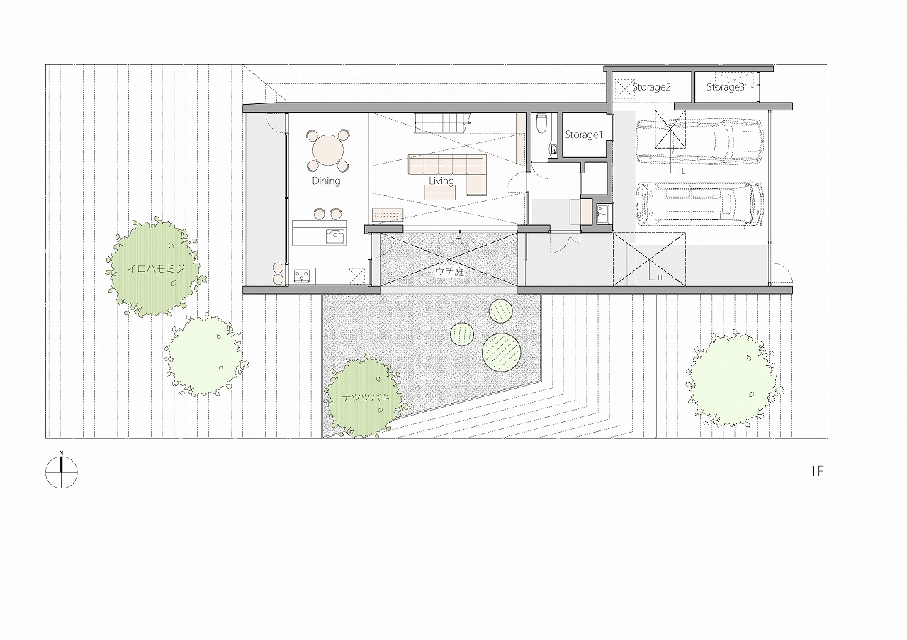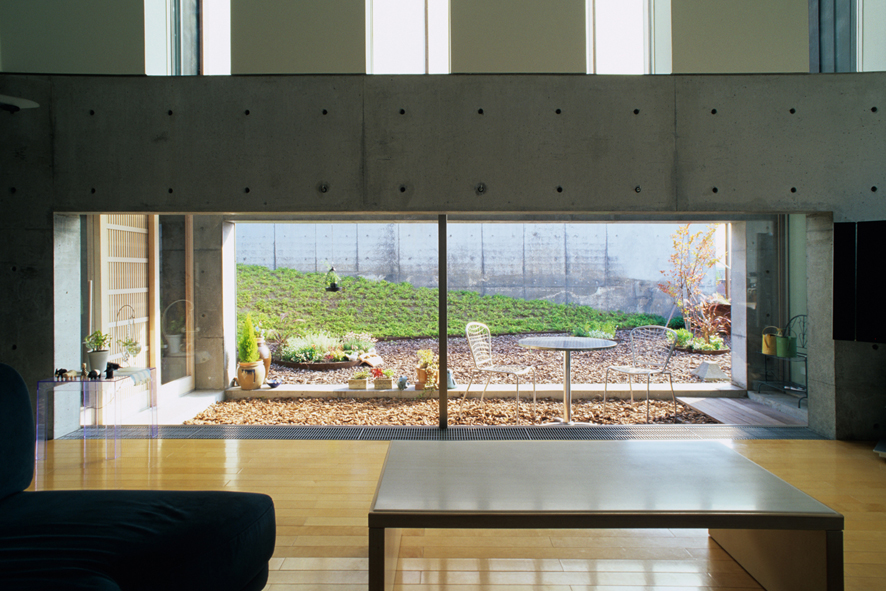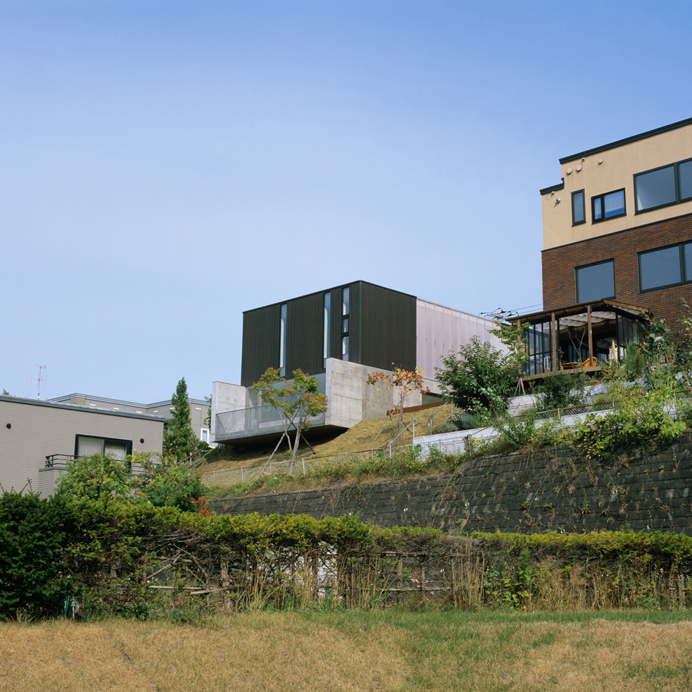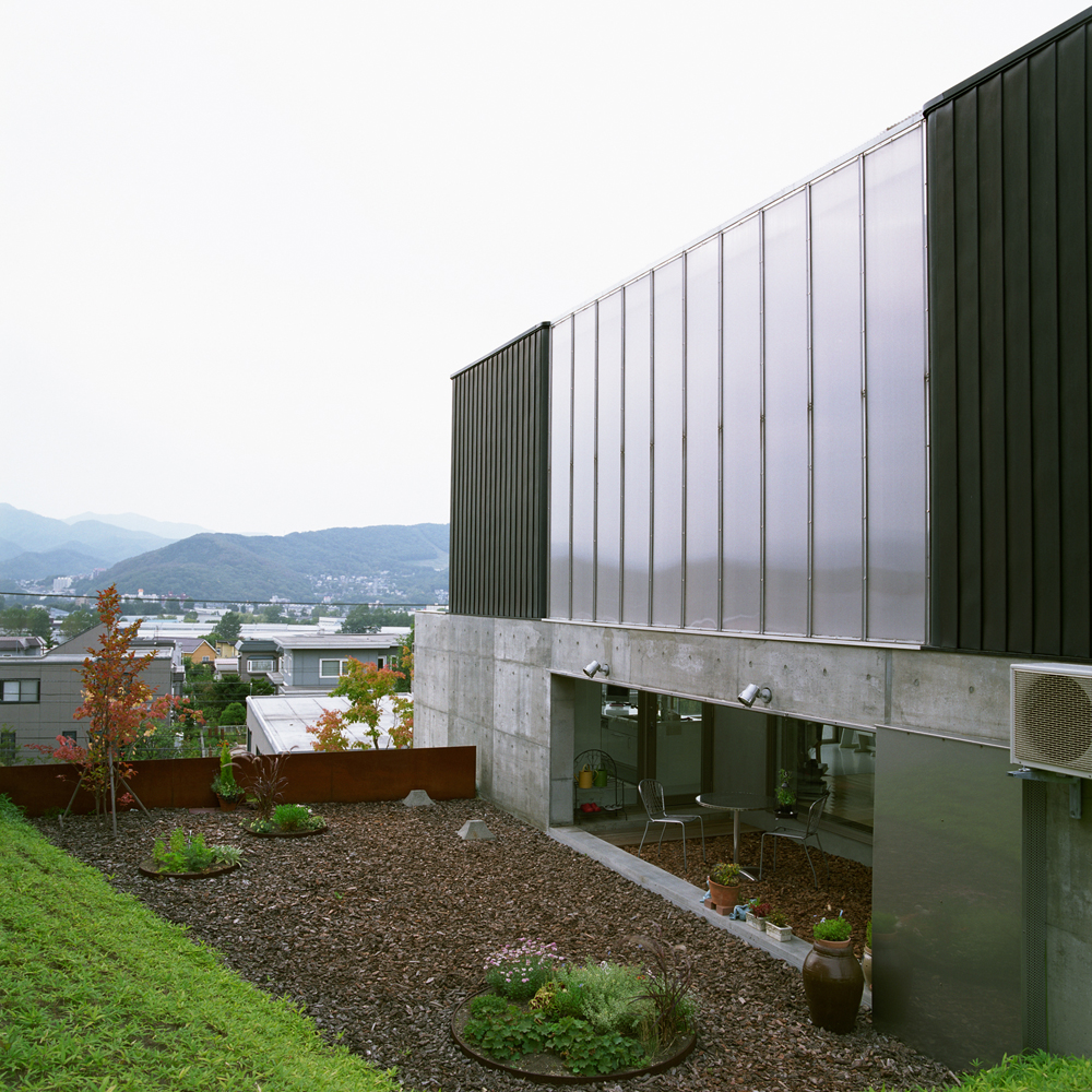 遠方に藻岩山を望むこの家は、遠くの山々が連なる風景を見ながら、住み手が行き来できる身近な庭の変化も感じられるように2つの方向に開かれたLivingを持つ。大きな自然と小さな自然が同時に意識される自然と人をつなぐ家づくりが目指されている。