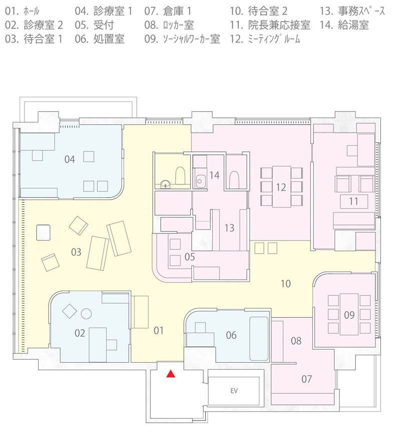 メンタルクリニックの待合として患者さん同士が近すぎず、それでいてお互いの気配は感じられる適度な距離感を確保する設計が求められた。そこで、森の中を巡りながら自分が気に入った居場所を探すように、その時々の心持ちに合った場所が見つけられるような待合にしたいと考えた。診察室や処置室は樹木のようなバランスで構成され、その隙間に出来たスペースにソファーやベンチ、一人用のチェアーを配置することで、「自分の居場所」を意識した待合空間を目指している。